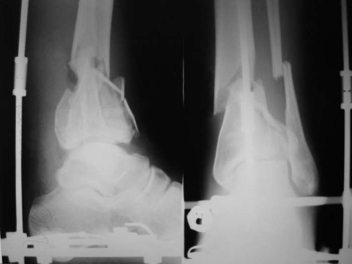 Здравствуйте, коллеги.Пять дней назад поступил молодой человек с DS: открытый внутрисуставной многооскольчатый перелом дистального метафиза правой б/берцовой кости, надсиндесмозный поперечный перелом м/берцовой кости со смещением. Нагноение раны.