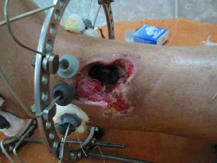 Надо сначала убрать мертвые куски кости, которые видно на фото, потом истинный размер дефекта обозначится. После этого, возможно, получится сделать vessel loop для постепенного сведения краев. Или пойти на укорочение с гофрированием, в общем, вариант закрытия пока рано обсуждать.