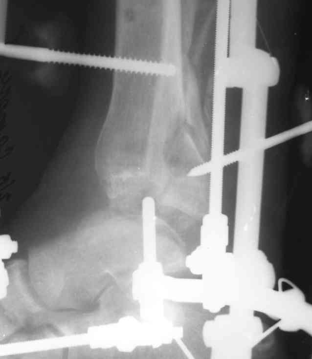 Срепонировать суставную поверхность мне не удалось. Только зря прошил ткани, а отломки остались в прежней позиции. Так и подмывало провести спицу через ахилл ... или пойти открыто задним доступом и притянуть винтом. Но смущает один момент: на чем будет держаться резьбовая часть винта, если передная поверхность разбита в хлам? Винт будеть елозить и не даст должной копрессии. Есть ли резон, при нынешнем состоянии раны, пойти на открытую репозицию заднего отдела суставной поверхности?