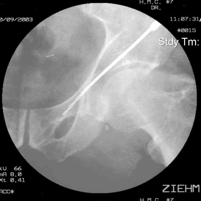 OK, now we're inserting the drill percutaneosuy using a sleeve. This fluoro shot is not for this patient (notice no clamp) but I was too lazy to go searching the PACS for one with the clamp on, so pretend...I'll save the next ones and send along...the imaging is the same and the clamp doesn't obstruct imaging other than very rarely...you can always tilt the C-arm a bit to clear it if the clamp obstructs the exact spot that you'd like to see. We'll assume that everyone knows the safe zone for a medullary ramus screw. Use a calibrated drill and sleeve of known length to simplify your life...or use Alex's fancy cannulated screws...I like 3.5mm screws because the oscillating 2.5mm drill bounces and remains intraosseus when it oscillates and contacts endosteal cortical ramus... so will the screw, and like a long bent screw IF the fracture is clamped... if unclamped, when the screw contacts the endosteum, it pushes the reduction apart instead of bouncing. The big 7mm cannulated screws fit few patients and extrude...we very rarely use them any more...you'll see an old one later.