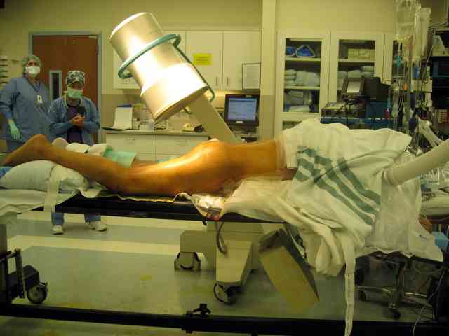 Here's a pic from the foot of the bed and you can see the clamp in the wound and the knee is extended so he must've had a tight rectus. The C-arm is rolled back to an obturator oblique image to reveal the anterior column...we put a slight outlet tilt to combine the images and give a better view of the anterior column...we can see the posterior column limb reduction in the wound, we can palpate the quadrilateral surface limb, and the image demonstrates the anterior column portion...you can adjust the tilt and rotation to image tangentially to the fracture plane if you'd like. We've inserted a 2mm K wire to site the starting point and aim/orientation for the drill and screw