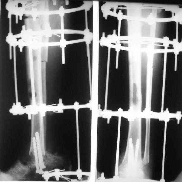 Уважаемые коллеги!Мы представляем послеоперационные рентгенограммы пациента, ситуация с которым послужила поводом для данной дискуссии. Прилагаем послеоперационные рентгенограммы. Во время операции мы удалили кортикальный слой по передней и задней поверхностям нижнего конца большеберцовой кости и при анализе рентгенограммы может сложиться ложное впечатление, что между соединяемыми костями уложен большой костный трансплантат. Но нам удалось добиться хорошей стыковки между большеберцовой и пяточной костями.На большеберцовой кости имеются следы лечения хронического «стержневого» остеомиелита (некрсеквестрэктомия за 2 месяца перед последней операцией). Александр Николаевич, Ваш пример с блокируемым штифтом подкупает своим изяществом. А мы то по наивности думали, что мы лучшие в мире. Оказывается, это не так. Да-а-а, немного обидно.(П.И.) Спасибо всем за помощь. А. Федосов, О. Диденко, П. Иванов. Отделение множественной и сочетанной травмы НИИСП им. Н.В. Склифосовского, г. Москва. < | >