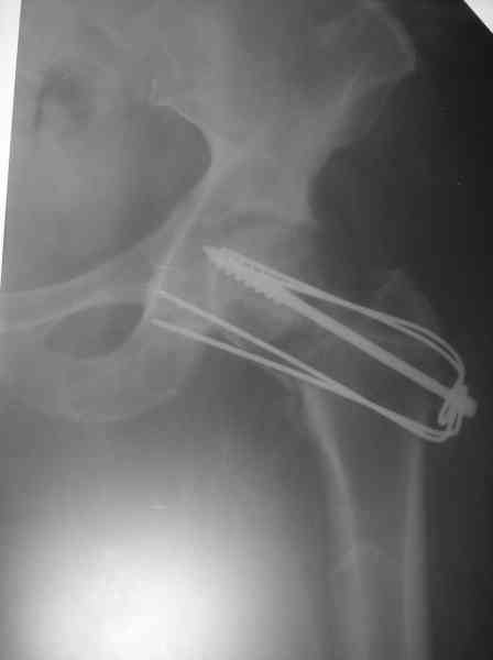 Где-то с 2001 г. начали оперировать шейки бедра, но теперь так же вынужден отказывать больным - сломался аппарат "Арман". Прооперировали пару больных по Вашему методу (Y-образными спицами). Но потом стали делать примерно так: 2-3 Y-образных спицы нанизывали на мощный винт и дополнительно перегибали ещё в одной плоскости. Затраты и оперативная агрессия примерно та же. Получается довольно жестко. Я Александру Николаевичу отосылал где то 1 год назад патент на изобретение. Прооперированно в настоящий момент 5 больных, к сожалению в 1-ом случае пришлось удалить фиксаторы из-за психоза через неделю после синтеза. В 2-х случаях переломы сраслись конечность опороспособная, в одном случае перегиб винта (к сожалению пришлось испоьзовать вместо винта стержень от аппарата довольно тонкий). А вообще-то эта проблема на уровне городских, ЦРБ, как система лечения не решена, в основном конечно в организационном плане. Хотелось бы, чтоб руководители нашего здравоохранения задумались и конечно внесли бы остеосинтез шейки в стандарты лечения. Посылаю снимок через 3 месяца после синтеза.
