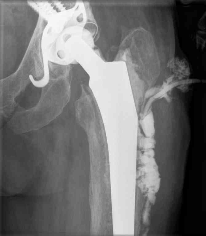 В 2004 году установлен эндопротез с гладким п\о течением и заживлением раны. На протяжении всего времени больную беспокоили боли в области паха: бедра. Поступила с обстрением болевого синдрома и уже в отделении развился покожный абсцесс с формированием свища. Фистулография- в приложении.