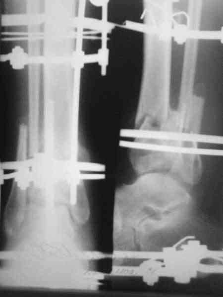 Нет, спицы не текли, а появился отек стопы и боли в области сухожилий разгибателей пальцев в конце процесса "гофрирования". Так как репозиции отломков метафиза мне достичь не удалось, то решил убрать их за ненадобностью. Может, попытаться открыто провести репозицию заднего края lag screw задним доступом? Правда время с момента травмы уже 30 дней. Или лучшее враг хорошего? Чем больше занимаюсь этим больным, тем больше вопросов.