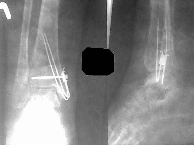 В данном случае - ложный сустав внутренней лодыжки на фоне оперативного лечения кортикальным винтом 3,5 и спицей. Часть внутренной лодыжки была лизирована. Проведена костная аутопластика. Результат налицо.