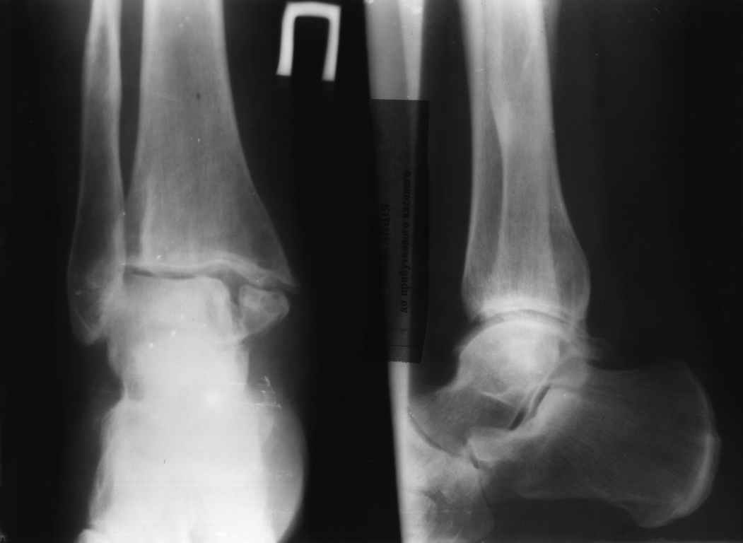 В данном случае - ложный сустав внутренней лодыжки на фоне оперативного лечения кортикальным винтом 3,5 и спицей. Часть внутренной лодыжки была лизирована. Проведена костная аутопластика. Результат налицо.