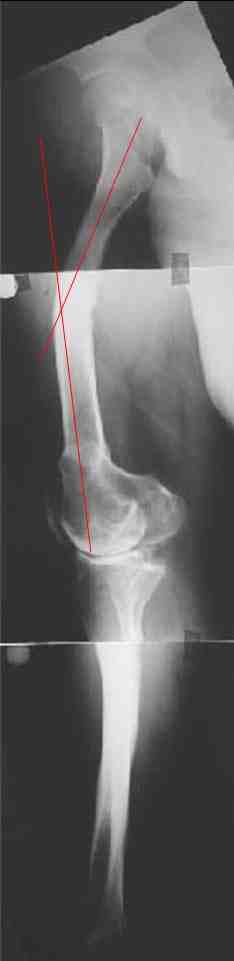 В данном случае перед эндопротезированием мы бы корригировали оси бедренной и большеберцовой костей (см. вложение). Дистальный эпидиафизарный угол бедра будет корригирован при эндопротезировании. Тип остеотомии и коррекции деформации (клиновидная резекция - одномоментная коррекция; формироване треугольных или трапециевидных регенератов во времени) - исходя из