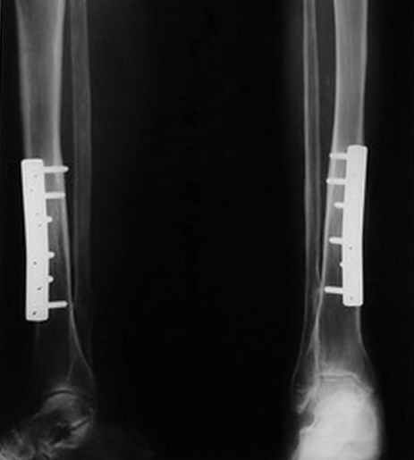 Со слов пациентки оперирована в 1997 году. После выписки из стационара нигде не наблюдалась. Данная картина уже 3 года. Пластинка появлялась постепенно после падения на оперированную конечность. На вопрос, почему не обратилась к врачу, ответила, что не посчитала нужным, хожу нормально, ничего не болит!