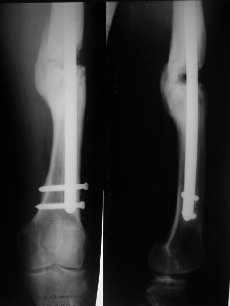 Давайте посмотрим на снимки бедра. В принципе, с наличием "эндопротеза диафиза" в виде мощного интрамедуллярного стержня не надо убиваться с обширными вмешательствами на очаге с кровопотерями, создавать большую площадь контакта, замещать все дефекты. Достаточно образования после дистракции узенького мостика по одной стороне. Со временем он упрочится, стержень в канале будет помогать сохранять длину и ось несколько лет. Даже если не будет смыкания трубок, можно потом стержень отпереть, за счет этого улучшиться контакт. Можно сделать реостеосинтез с рассверливанием стержнем большего диаметра. Важно, что все это время можно нормально пользоваться конечностью.