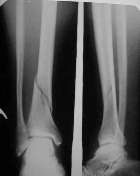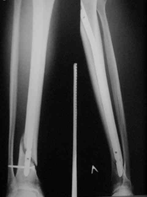 Здравствуйте коллеги!Больной 29 лет поступил 1 мая с Диагнозом: Закрытый спиральный перелом н/3 большеберцовой кости, перелом в/3 малоберцовой. На пятые сутки выполнен вот такой остеосинтез (см R-gr) . На сегодня мы имеем перелом нижнего винта, замедленное сращение( R- gr от 11.09.06) Больного ничего не беспокоит, ходит с костылями с ограниченной нагрузкой. На наш взгляд возможно обойтись :1 Удаление сломанного винта и верхнего блокирующего с последующим более глубоким погружением штифта и его дистальным блокированием. Либо замена на более длинный (Экперт-Синтез).2 Остеотомия косая малоберцовой кости.С большим вниманием выслушаем возможные варианты, тактики в таком случае.С Уважением Владимир Бахарев.P.S Извинямси за качество снимков!