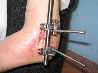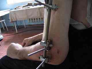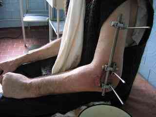 Уважаемые коллеги. Внешний вид конечности через 5 недель после травмы. Рана гранулирует, отделяемое скудное. Прошу строго не судить за внешний вид АВФ: ну нет пока у нас параллельных зажимов (приходиться выкручиваться).