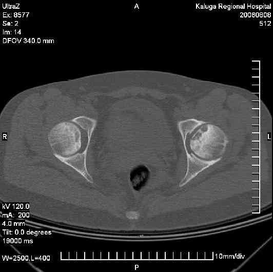 В данной ситуации самый оптимальный выход - эндопротезирование тазобедренного сустава. Даже на представленой кт-грамме имееются признаки перелома субхондральной костной пластины в области зоны некроза. Думаю на стандартной рентгенограмме и кт-срезах максимально нагружаемых зон головки картина была бы более показательной. На данной стадии заболевания любые так называемые "органно-сохраняющие" операции малоэффективны. Любая хирургическая агрессия приведет лишь к ухудшению кровообращения головки бедра,а ротационно-флексионная остеотомия - к нарушению биомиханики сустава (с последующим быстрым развитием вторичного артроза).Как следствие - дальнейшее быстрое разрушение головки бедра. Кроме того, послеоперационный период после данных операций очень обременитеный для больных (безнагрузочный период оперированной конечности до 3 месяцев, период полной реабилитации до 6 месяцев). Эффект от таких операций, по нашему опыту, не более 5 лет (как правило около 3 лет), затем снова встанет вопрос о необходимости эндопротезирования. Правильно подобранный и установленый имплантат (эндопротез)дает пациенту 15-20 лет нормальной, в бытовом плане полностью адаптированной жизни. В последующем потребуется ревизионное эндопротезирование. На мой взгляд стоит принять совет господина Мамонова о необходимости дальнейшего обследования пациета на предмет выявления причин развития асептичекого некроза. На исход леченич пораженных головок бедренных костей это не повлияет, но вовремя начатое лечение, возможно,поможет избежать поражению других костей (плечевая, таранная, ладьевидная и т.п.).