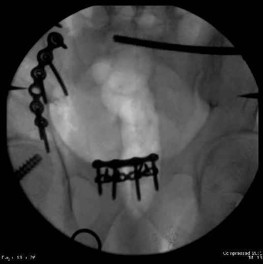Then 6-hole plate along brim with 1 screw in R sacral ala. Then lagged 2 screws along crest A --> P. finally 10-hole plate along inner aspect of crest. R posterior ilium still a bit stepped off.