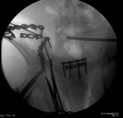 Then 6-hole plate along brim with 1 screw in R sacral ala. Then lagged 2 screws along crest A --> P. finally 10-hole plate along inner aspect of crest. R posterior ilium still a bit stepped off.