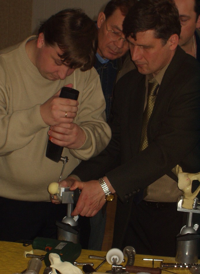 Уважаемые коллеги! 5-6 октября в МОНИКИ под председательством проф. В.П. Волошина прошел II образовательный курс школы ортопедической хирургии им. проф. О.Ш. Буачидзе. Тема курса: "Цементное эндопротезирование тазобедренного сустава". Помимо планирования и собственно оперативной техники большое внимание было уделено последним сведениям по цементам (доклад проф. Н.С. Гаврюшенко - зав. испытательной лабораторией ЦИТО) и биокомпозитным материалам для замещения дефектов костной ткани (доклад В.Е. Формазюка - гендиректора холдинга IKVAA). Под патронажем последнего была организована выставка продукции для ортопедии чешской фирмы БЕЗНОСКА и немецкой "AAP". Мне лично понравился "цемент" для заполнения полостей, который вводится стандартным шприцом под укрепляющее кольцо и в течении двух-трех месяцев прорастает костью. Культурная программа включала посещение гостевого дома посольства Чехии - пиво и кнедлики. Много писать про это не буду, чтобы не будить на форуме черную зависть. Было все бесподобно! Еще раз огромное спасибо организаторам. Юрий Алексеевич Булахтин < | >