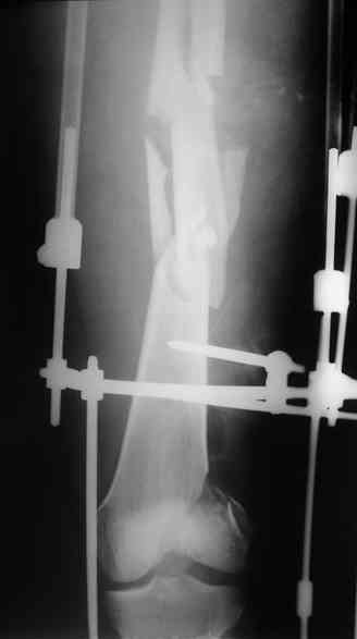 Конкретного клинического материала, который показал высокий уровень осложнений при одномоментной смене наружного фиксатора на стержень нет, потому что мы так никогда не делаем. Я не так давно работаю, но пока что эта тактика оправдывает себя. В обзорах тоже этого не нашел (что касается бедра, про голень-то много говорят).