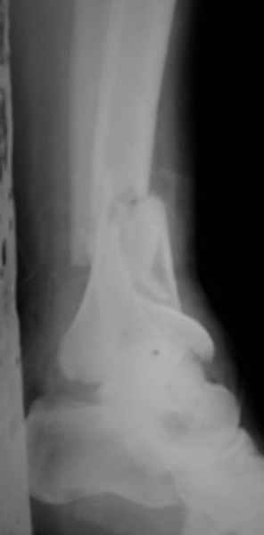 Этот пример не "пациента с оскольчатым переломом обеих лодыжек..." - это была бы непрямая травма, отрывные переломы. Тут как раз типичное прямое повреждение дистального суставного конца tibia, когда таран действует как молоток, а малоберцовая может вообще остаться целой. Репозиция почти хорошая, передний край остался чуть проксимальнее.