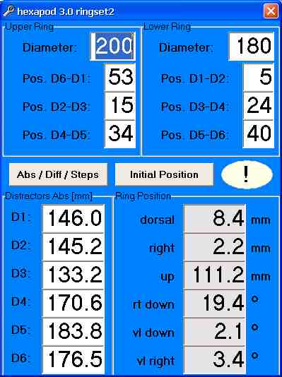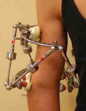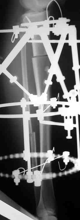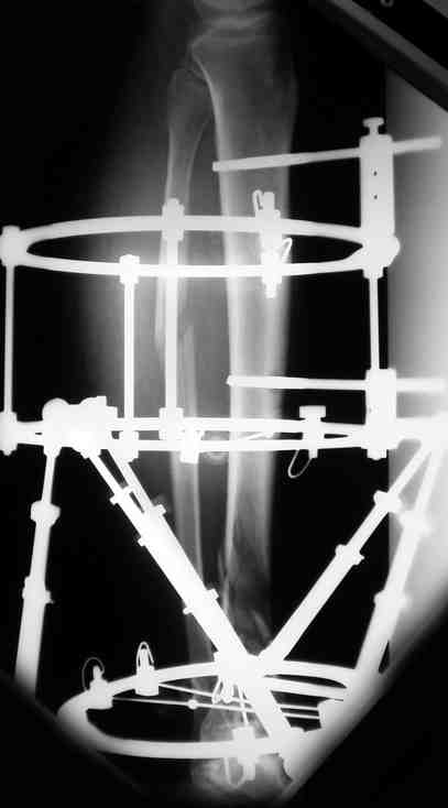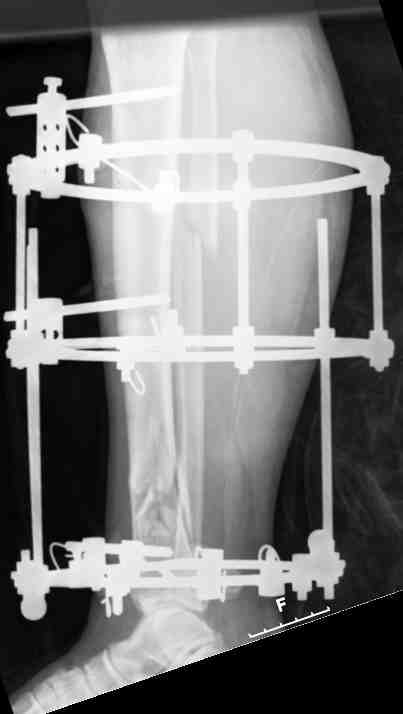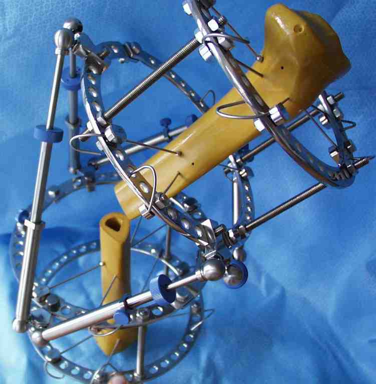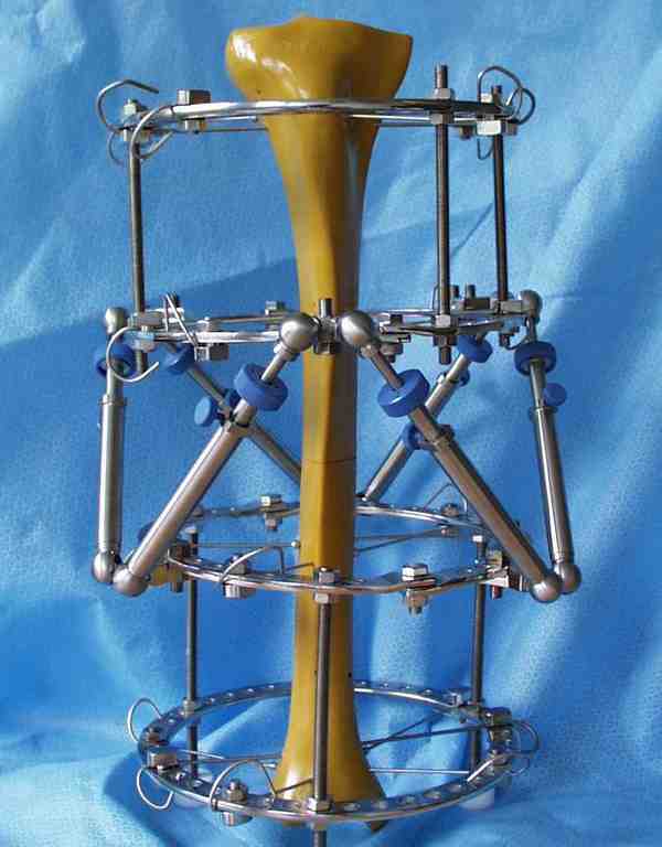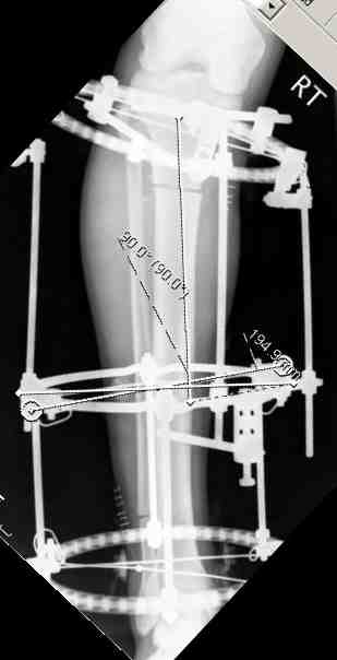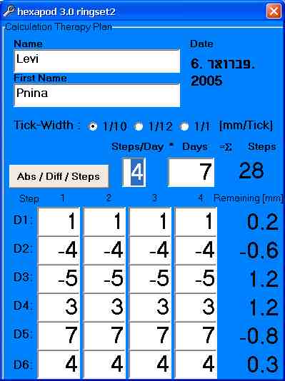 The Y- adaptors can be utilized with all types of the Ilizarov rings. It is possible to place the adaptors freely along the rings as necessary. The connection between the Y-adaptors and the distraction rods is through a universal ball and socket joint. Программа очень проста и не требует подключения к интернету. Базовые данные включают размеры колец, положение У-адапторов на кольцах и размеры дистракционных стержней. После введения в компьютер этих данных, программа выдает положение проксимального кольца относительно дистального. The software is very simple to use and does not need any connection to the Internet. The base data needed includes the diameter of the upper and lower rings, the positions of the Y adaptors on each ring and the length of the distraction rods. After the input of this data into the computer, the program shows the initial position of center of the upper ring in relation to the lower. Середина дистального кольца является центром отсчёта, From this point, all adjustments are made with specific reference to the central point of the lower ring, since this ring remains in a static position. относительно этой точки вводится в программу место расположения оси исправления деформации или репозиции и их величины последовательно во всех плоскостях относительно 3-х осей в 6-и степенях свободы. All adjustments can be in three planes. The CORA is entered in relation to the center of the distal ring and the desired correction entered into the computer. The software then makes the appropriate adjustments for deformity correction consistently for each plane according to the plan developed on the basis of the malalignment test along three axes with six degrees of freedom. После соответствующей обработки, компьютер выдаёт программу, дающую возможность с точностью до 1 градуса и 1 мм. производить закрытые манипуляции с фрагментами!!! Коррекционный план включает время коррекции, её частоту в соответствии с выбором хирурга. Каждая цифра на плане означает количество кликов на соответствующем дистракционном стержне, каждый клик составляет 0,1 мм. The software displays a plan for correction detailing the steps according to the surgeons input of the number of days and steps desired. The numbers on the slide enumerates the number of clicks on each specific distractor necessary to obtain the desired correction. Each click is a 0.1mm length of distractor. Кроме того, компьютер выдаёт окончательную длину стержней и изменения между кольцами, так что можно следить за процессом коррекции без дополнительных рентгеновских снимков, только по измерению длины стержней. Beyond this, the software determines the final length of the distractors and the changes between the rings so that the progress and changes can be monitored to assure that the changes have occurred appropriately along the scheduled plan. Нет необходимости накладывать Гексаподный сет на операционном столе. Его установка и снятие занимает около 15 минут, безболезненное. There is no necessity to establish Hexapod in operation room, it application and removal is quick, taking only about fifteen minutes for each procedure, and is pain-free.