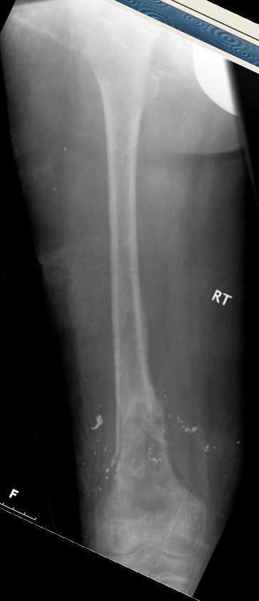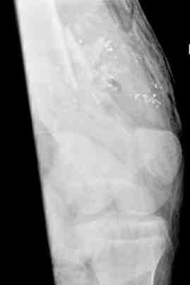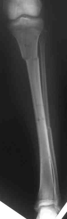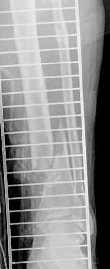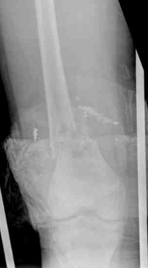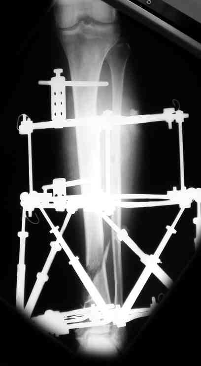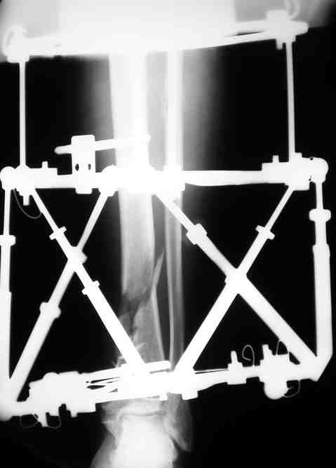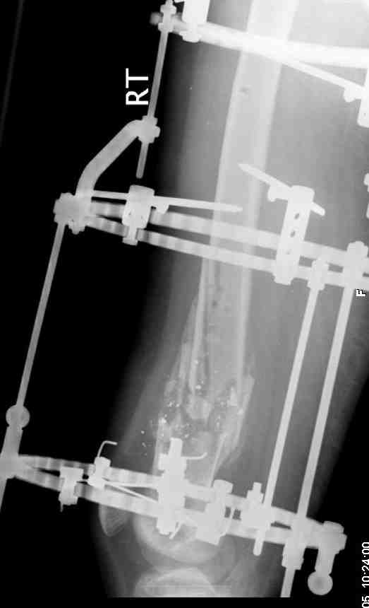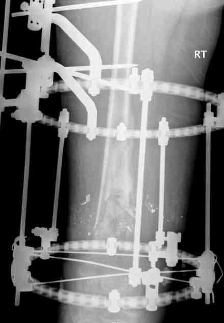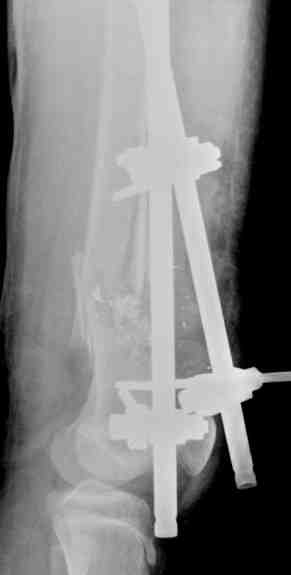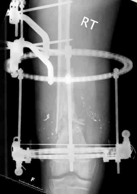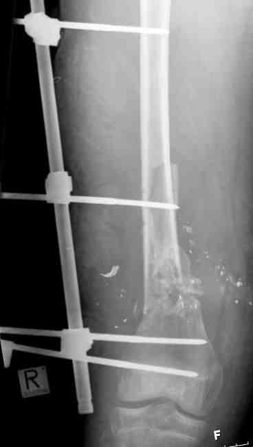 There are X-Rays of a thirteen year old boy with a comminuted distal femur fracture secondary to a gunshot wound, initially treated with an AO external fixator. The alignment was unacceptable and an Ilizarov external fixator was applied three weeks after the injury. No attempt of definitive reduction was made during the surgery.
