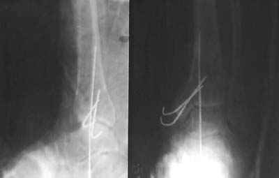 После совместного осмотра с зав.отд.микрохирургии пациент госпитализирован в клинику микрохирургии. Дежурными врачами этой же клиники принято решение сохранить конечность, выполнены ПХО, фиксация спицами, гипсовая иммобилизация. Результаты - см.приложение.