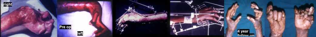 Distraction is ideally suited for such instances. The UMEX fixator is perfect. Light and yet strong. Erected on smooth pins and with differential distraction and gradual angular (manual) correction, the wrist and the finger deformities will most certainly correct to a great extent. ((A computer modified model picture of the frame is attached)