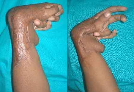 Etiology: Post burns contractures of the hands and the wrists Time elapsed since episode: 9 months In frame time: 7 weeks follow up after 4 years (his son had a compound supracondylar femoral fracture and he brought him to us for treatment from approximately 1600 kms away!)