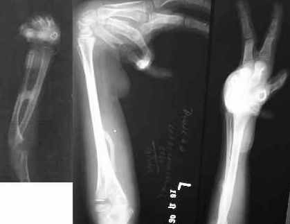 Distraction is ideally suited for such instances. The UMEX fixator is perfect. Light and yet strong. Erected on smooth pins and with differential distraction and gradual angular (manual) correction, the wrist and the finger deformities will most certainly correct to a great extent. ((A computer modified model picture of the frame is attached)