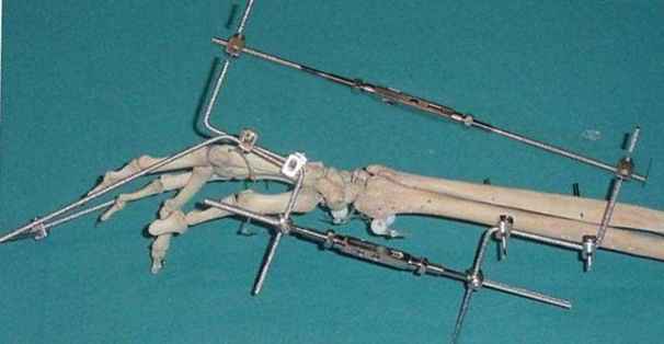 Это идеальный случай для закрытого выведения с помощию Гексаподного аппарата Илизарова или аппарата Тейлора!!! Оба эти аппарата имеют виртуальный шарнир и позволяют при правильной его установке точно вывести кисть из положения пальмарной флексии. Классический аппарат Илизарова так же может быть применён, проблема в том, что кистевой сустав не имеет одной оси, их две, поэтому при установке одного шарнира может произойти подвывих. Чтобы этого избежать, необходимо делать снимки каждые 10 градусов коррекции.