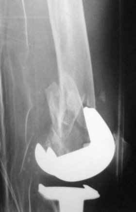 I doubt if I could lock a nail (either antegrade or retrograde) distal to the fracture which extends virtually to the implant. I have similar concerns about plate fixation. Has anyone got a reasonable volume of experience with this type of fracture?