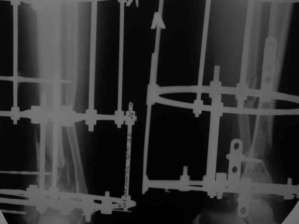 Больная проносила его 6 месяцев. Все чего мы смогли добиться- сохранить отломки в куче, приблизительно напоминающей вилку голеностопного сустава. Надо будет постараться убедить ее проносить его еще сколько-нибудь. Патологическая подвижность в области н/3 голени есть. Если предположить, что мы добьемся артродезеа, не факт, что перелом срастется. Стопа в эквинусе 120гр.