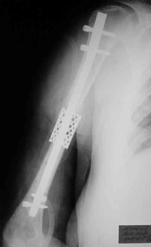 Через 2 недели интрамедуллярный остеосинтез с замещением дефекта кости цилиндрическим металлокаркасом (А.Ф. Лазарев подарил). Дренажи удалили, раны зажили, свищи закрылись. В конце августа благополучно выписана с движениями в локтевом суставе в объеме 0-10-100 град. в плечевом - отведение 45, сгибание -60 (стакан поднять могла). 27.11 в состоянии не прекращающегося после выписки опьянения получила закрытый надмыщелковый перелом плеча на уровне дистальных блокирующих винтов в результате адекватной травмы. Снимки прилагаются. Коллеги, как бы Вы лечили такой перелом, не принимая во внимание социальный статус и "безграничные" материальные возможности пациентки. Жду советов, комментариев и критики. А.Семенистый.