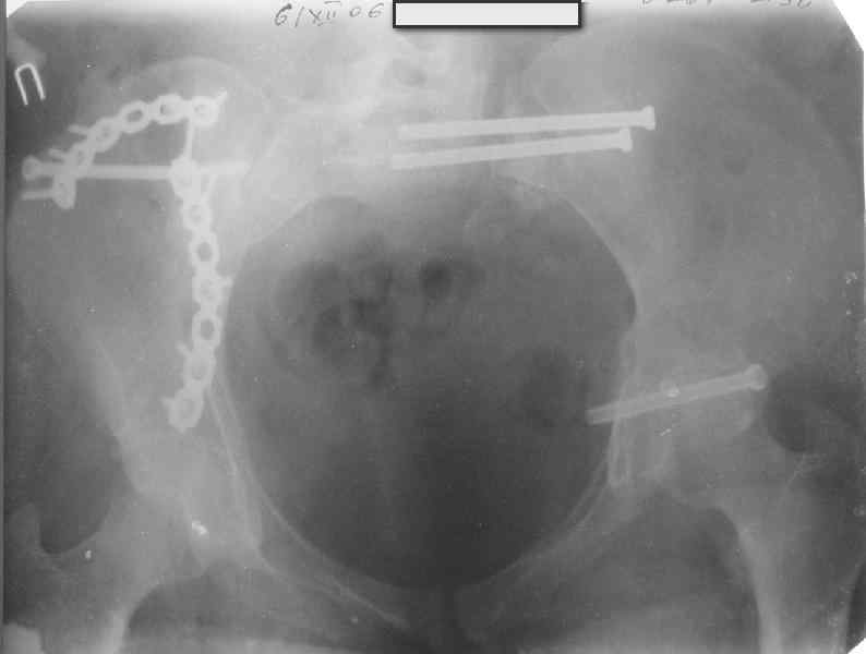 из Здравствуйте, коллеги. Какие будут мнения по поводу лечения представляемой больной? Молодая девушка 19 лет, травма 1 год назад, тогда же прооперирована. В настоящее время имеются ноющие боли в области крестца слева, нарушение походки, ощущение неуверенности, слабости в левой нижней конечности, неврологически -непостоянные парестезии в левой нижней конечности. Ходит с дополнительной опорой, страдает от ожирения. Какова по вашему будет оптимальная тактика в отношении несращения крестца? Замена винтов на более длинные с коррекцией их положения+ туннелизация зоны нестращения, открытое вмешательство с костной аутопластикой или еще какие варианты? В приложении снимки при поступлении и послеоперационные год назад.