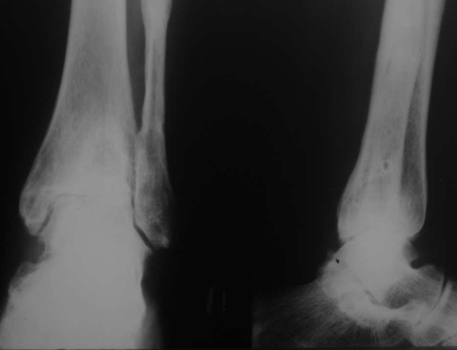 Артроз, во-первых, вследствие неконгруентности суставных поверхностей - имеется укорочение малоберцовой кости; во-вторых имеется синостозирование берцовых костей (вместо тугоэластисчного синдесмоза).