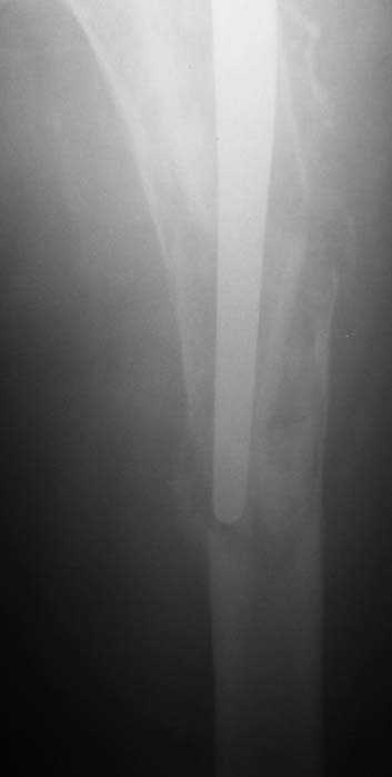 через перелом с удалением самой ножки, костного цемента и рубцовых тканей. Установка ножки дистальной фиксации (типа Solution), длину ножки