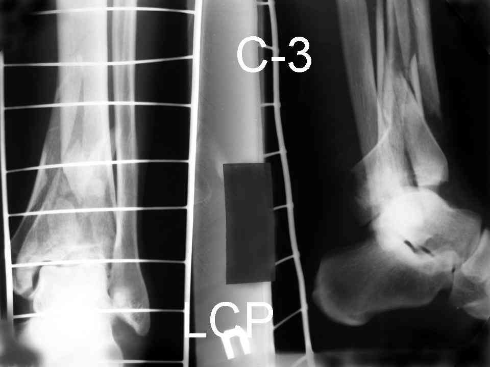 На рентгенограммах типичный перелом пилона по типу С-3. есть опыт до 100 открытых опреаций у нас в клинике. 20 примерно в год. Принцип один -все внутрисуставные переломы нуждаются в открытой репозиции и внутренней стабильной фиксации. При поступлении КТ не надо, так как получается только нагромождение костей. Истинной картины нет. Главное восстановить длину малоберцовой кости - это ключ к успеху. При поступлении меньше всего надо думать о сосудистых расстройствах, т.к. сама операция и репозиция даже сначала частичная даёт улучшение сосудитых нарушений. Причём очень быстро. Операция в 2этапа. При поступлении доступ позади наружной лодыжки, причём обязательно. После этого репозиция малоберцовой кости и фиксация пластиной 1/3 трубки под винт 3,5. Дренаж и любой аппарат наружной фиксации. Затем после спадения отёка на 5-7-10 день аппрат снимается и дугообразный разрез спереди от медиальной лодыжки 10-12 см. Главной чтобы расстояние между 1 и вторым разрезом было не меньше 7-8 см. Тогда не будет некрозов лоскутов. Таранная кость используется как матрица на неё укладываются отломки и фиксируются пицами. Ренг-контроль. Отломки лежат все отдельно, но ничего не высыпется. При переломах С-3 всегда нужна костная пластика (из крыла). Фиксация пластиной лист клевера простой или LCP. Гипс не нужен. Дренаж до 48 часов. Операция длится 3-4 часа обязательно без жгута. Посылаю примерно такой же случай.