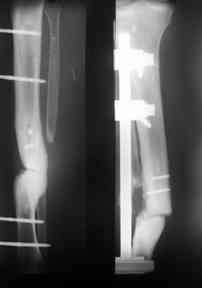 В результате падения получил травму голени, резкую потерю опороспособности, наличие раны по наружной поверхности голени в виде лучей 3х10х 4х8 см.Дном раны является кость. Кожа представляет из себя рубцы, которые "взорвались" при воздейстии на них отломков, вернее концов ложного сустава. Даже диагноз сложно сформулировать, скорее открытый ложный сустав 2-3типа. Первично срержневой аппарат,аддаптирующие швы на кожные лоскуты,сохраняется дефект кожи 4х6 см, да и на окружающие кожно -рубцовые ткани надежд нет, намечается некроз.