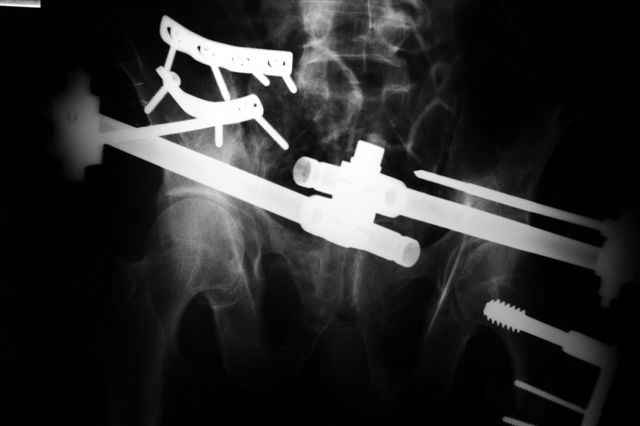 с недельным интервалом - стабилизация таза. Пациент оказался активным по своей природе, как только переломы были фиксированы, начал передвигаться с костылями. Нестабильное повреждение тазового кольца в сочетании с переломом лодыжки справа и переломом бедра слева не создавало возможности ограничения осевой нагрузки на н/к, поэтому и возникала дилемма как быстро его можно ставить на костыли. По словам пациента, послеоперационные боли были незначительны, больной, несмотря на возраст -58 лет атлетического телосложения, с хорошо развитой мускулатурой и отсутствием лишнего веса + желание выбраться из койки поскорее и пойти домой - всё вместе и способствовало ранней активизации.