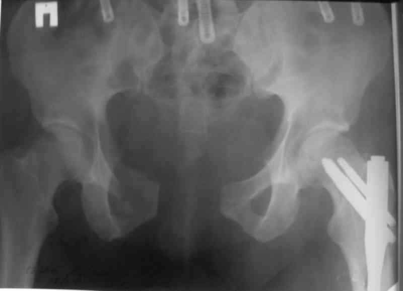 с недельным интервалом - стабилизация таза. Пациент оказался активным по своей природе, как только переломы были фиксированы, начал передвигаться с костылями. Нестабильное повреждение тазового кольца в сочетании с переломом лодыжки справа и переломом бедра слева не создавало возможности ограничения осевой нагрузки на н/к, поэтому и возникала дилемма как быстро его можно ставить на костыли. По словам пациента, послеоперационные боли были незначительны, больной, несмотря на возраст -58 лет атлетического телосложения, с хорошо развитой мускулатурой и отсутствием лишнего веса + желание выбраться из койки поскорее и пойти домой - всё вместе и способствовало ранней активизации.