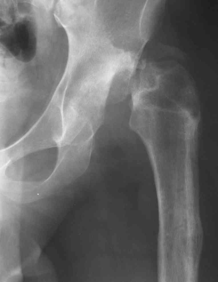 Почти 2 г назад низведение головки бедра проводилось в условиях аппарата Илизарова таз-бедро , затем проводилась отрытая репозиция головки бедра с межвертельной укорачивающей остеотомией. Признака некроза головки были видны интраоперационно (дефект хрящевого слоя, тусклый цвет), а рентгенологические признаки появились через 1-2 мес.