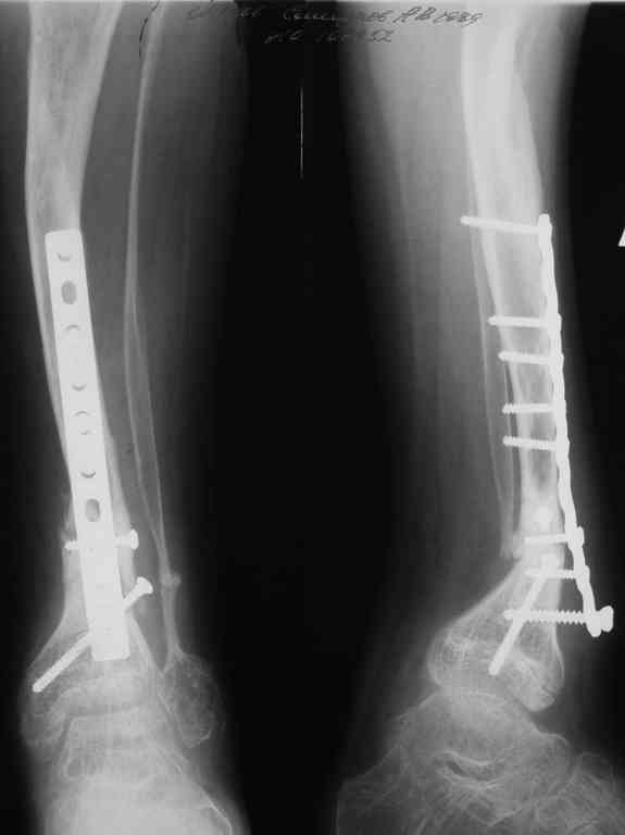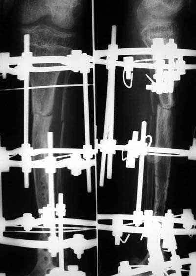 Уважаемые коллеги! В отделении на лечении наблюдается пациент 16 лет с диагнозом: Псевдоартроз костей левой голенив нижней трети. Вальгусная деформация обоих коленных суставов. Укорочение левой н/конечности11см. С 1997 года состоит на учёте у онколога с диагнозом: Рабдомиосаркома мышц тазового дна IV ст., с метастазами в метафизы берцовых костей.Проведена полихимиотерапия, лучевая терапия. В 1998 г. удаление опухоли. Послеоперационный период без особенностей. С 1998 года со стороны онкологии ремиссия, перестройка очагов метастазирования в берцовых костях по типу фиброзной дисплазии.В 1999 г. патологический перелом костей левой голени в н/трети. Лечение в гипсе 1.5 месяца, затем компрессионно-дистракционный остеосинтез апп. Илизарова. Сращения на месте псевдоартроза не достигнуто. С 1999г. ходит без нагрузки на левую н/конечность. Выраженный остеопороз костей н/конечностей. 17.11.05. Операция: Костная пластика зоны псевдоартроза левой б/берцовой кости по типу "русский замок", остеосинтез пластинкой и винтами. После начала нагрузки на конечность рецидив деформации, миграция фиксаторов. 05.12.06. Операция: Удаление фиксаторов из левой голени. Шарнирная остеотомия трети левой б/берцовой кости, остеотомия м/берцовой кости. Дистракционный остеосинтез апп. Илизарова. Устранены основные виды деформации б/берцовой кости. Планировали в дальнейшем несвободную костную аутопластику и интрамедуллярный остеосинтез с блокированием, но кость очень тонкая, склерозированная, выраженный остеопороз. Возникают большие сомнения о возможности сращения даже при этих условиях. Будем рады услышать ваши мнения по дальнейшему лечению данного пациента. Екатериан Анатольевна Озерова, детское отделение УНИИТО
