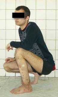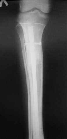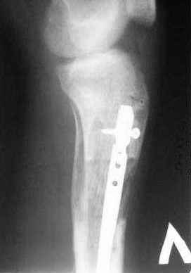 3,4 - через 4 недели наложен спице-стержневой аппарат, произведена остеотомия большеберцовой кости в верхней трети, раны зажили, проводилась дистракция в аппарате.