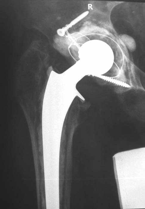Мужчина, 45 лет. 6 мес. назад перенес тотальное эндопротезирование правого тазобедренного сустава по поводу ложного сустава шейки бедра. Характер реконструкции вертлужной впадины не известен. Через 3 мес. после операции отметил щелчки и хруст при движениях в области эндопротеза. В анамнезе туберкулез легких. Сейчас, по заключению фтизиатра, в легких активного процесса нет. Местного воспаления нет.Предполагается нестабильность чашки в связи с бактериальным воспалением. Планируется удаление чашки и цемента, пластика дна измельченными аутотрансплантами и гидроксилапатитной керамикой, затем кольцо Мюллер, цементная чашка. Смущает и ножка - зона просветления вокруг мантии. Предложения по тактике?