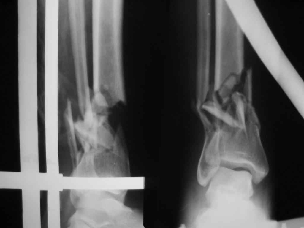 > Открытый перелом (1А Каплан)у женщины 39 лет - падение плиты на голень.