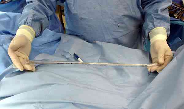 После определения длины канала берется 3мм длинная проволока, обычно "long guided wire" от интрамедуллярного набора, концы загибаются, ее