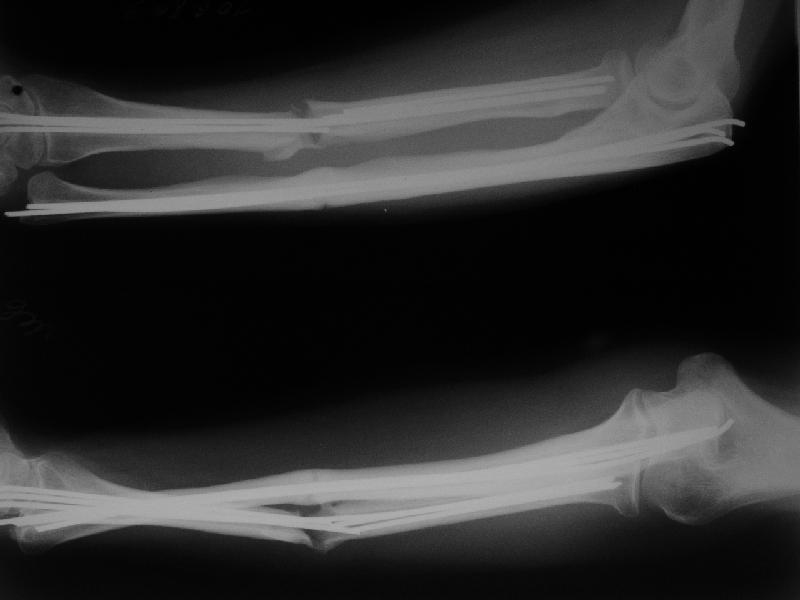 Подвижность усилилась примерно в 2 мес. (видимо, перелом спиц в лучевой кости). Движения в локтевом суставе N, ротация хорошая (подвижность лучевой кости), в кистевом тыльная 5-10 гр, ладонная 30 гр. Обсуждаем варианты реостеосинтеза. Спицы удаляем все, при удалении из центрального отломка лучевой без вскрытия кости в области перелома не обойтись. Если восстановить ось и длину лучевой кости, получается дефект ~1,5-2 см. Замещать дефект удлинением одого из отломков в аппарате? Долго, и функция кисти и пальцев может еще ухудшиться. Поэтому думаем про укорачивающую резекцию обеих костей, локтевой чуть больше, остеосинтез пластинами, наверно, LCP. Блокируемый интрамедуллярный остеосинтез тоже доступен, но есть ли тут у него преимущества? Или есть смысл попытаться не трогать локтевую, а заместить дефект лучевой аутотрансплантатом из крыла? Или резецировать головку локтевой? Какие вариант и почему тут предпочтителен, на Ваш взгляд? Спасибо! Александр Виноградский клиника травматологии УНИИТО