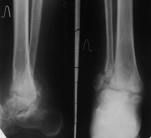 Можно: 65-летняя пациентка, оперирована по поводу несросшегося в гипсе перелома лодыжек с патологической вальгусной установкой стопы и выраженным нарушением опрной функции. Оперирована через 6 месяцев после травмы. Рентгенограммы через 4 месяца после операции.