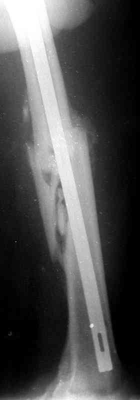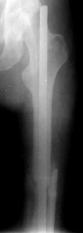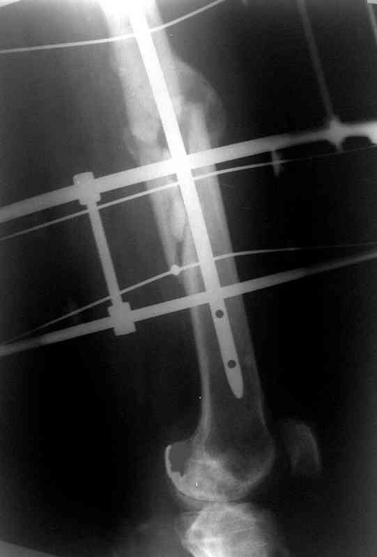 Фиксаторы удалены через 12 месяцев после операции, выполненной по поводу замедленной консолидации перелома бедра с его укорочением.