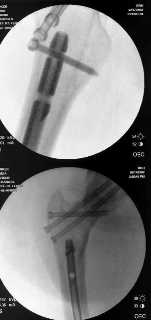 На снимках ложный сустав шейки бедра, несостоятельность фиксации. По положению шурупа можно предсказать ложный сустав, например, если screw backup за кортикальный слой около 15-20 мм, и также изменение угла от первоначального.