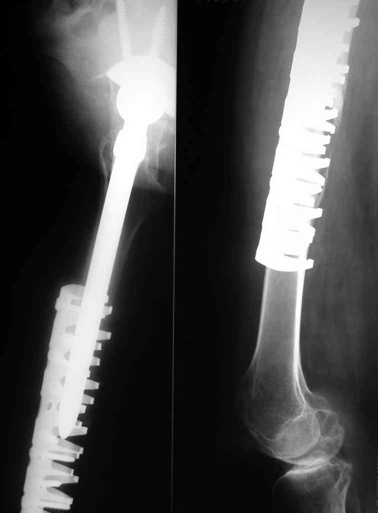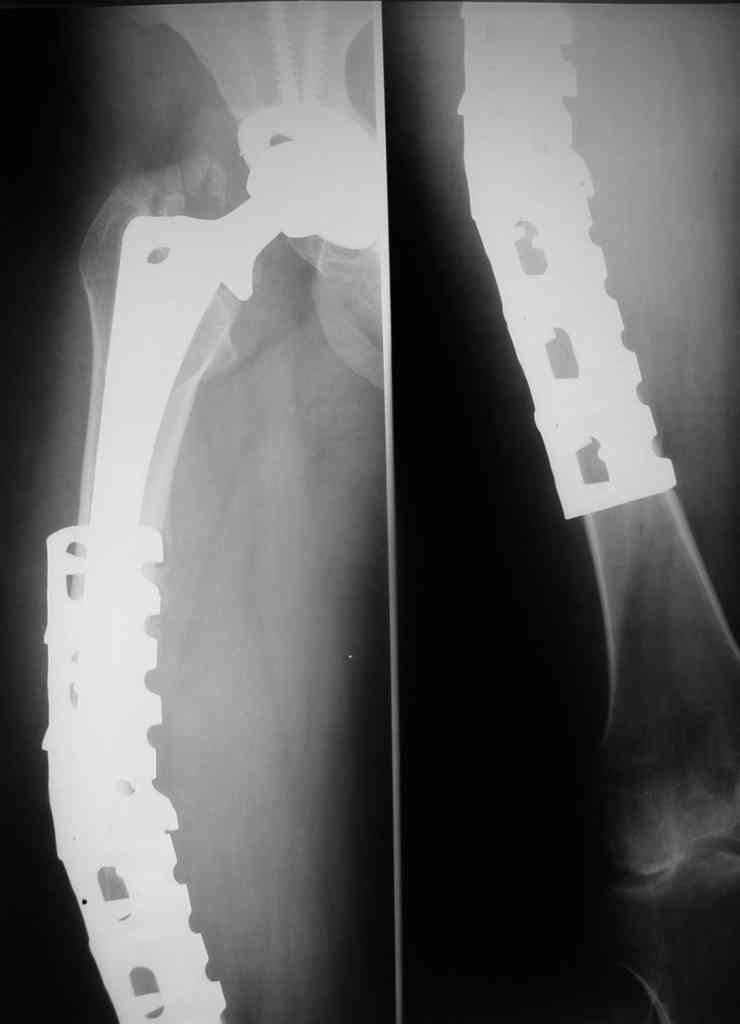 В июле 2004 года больной было выполнено тотальное эндопротезирование правого тазобедренного сустава бесцементным эндопротезом DePuy c ножкой AML. Послеоперационный период проходил гладко, исходом операции пациентка была довольна. В июне 2006 года в ДТП была сбита автомобилем и получила поперечный оскольчатый околопротезный перелом в с/з диафиза бедра, с сохранением стабильности ножки протеза. Через 2 недели после травмы в клинике был произведен открытый остеосинтез бедра пластиной Bridge Plate DePuy. Больная ходила с костылями, через 3 месяца после остеосинтеза начала постепенно увеличивать нагрузку на ногу. Через 6 месяцев клинически и на контрольных рентгенограммах было выявлена деформация бедра. Планируется провести реостеосинтез бедра аналогичной пластиной большей длины с применением костной аутопластики и (или) материалов типа MIIG, IGNITE, ALLOMATRIX. Хотелось бы услышать мнение по альтернативной дальнейшей тактике лечения данной больной и узнать о результатах применения Bridge Plate в других клиниках A female 24 y.o with juvenile rheumatoid arthritis was operated in July 2004 - THA (DePuy AML). All was OK, the patient was satisfied. June 2006 - in a car accident sustained periprosthetic shaft fracture. Two weeks later ORIF with Bridge Plate (DePuy) was performed. 3 month on crutches, then started to increase weight-bearing. 6 month later the deformation was obvious. The current plan is to perform ORIF with longer plate og the same design with bone grafting and/or bone substitutes like MIIG, IGNITE, ALLOMATRIX. Is the plan reasonable, maybe any alternative exists? Any other treatment modalities? Can somebody share results of such Bridge plating? THX for your suggestions. С уважением Василий Бабушкин. Екатеринбург